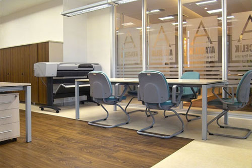 Sekreterlik ve açık ofis alanları dışındaki mahaller MBD-70 Demonte Bölme sistemi ile bölümlendirildi. Asma tavan ve bölme duvar rengi olarak metalik gri veya satine eloksal kullanıldı. Bölmelerde çift cam arası jakuzi uygulaması ve şeffaflık istenen mahaller de kumlu cam kullanıldı. Kasalı Kapılarda, metal öğe devamı için ithal eloksal alüminyum levhadan üretilen pervaz ve alüminyum kasa tercih edildi. Yer döşemesi olarak Tarkett Sommer I.D. Moduline, ahşap ve mermer desenli pvc yer döşemesi birlikte kullanıldı. Kaj radyatörleri, gömme dolapları da tarafımızdan hazırlanan ofis çalışmamızda "modern, konfor ve estetik" kriterleri bir arada kullanıldı.